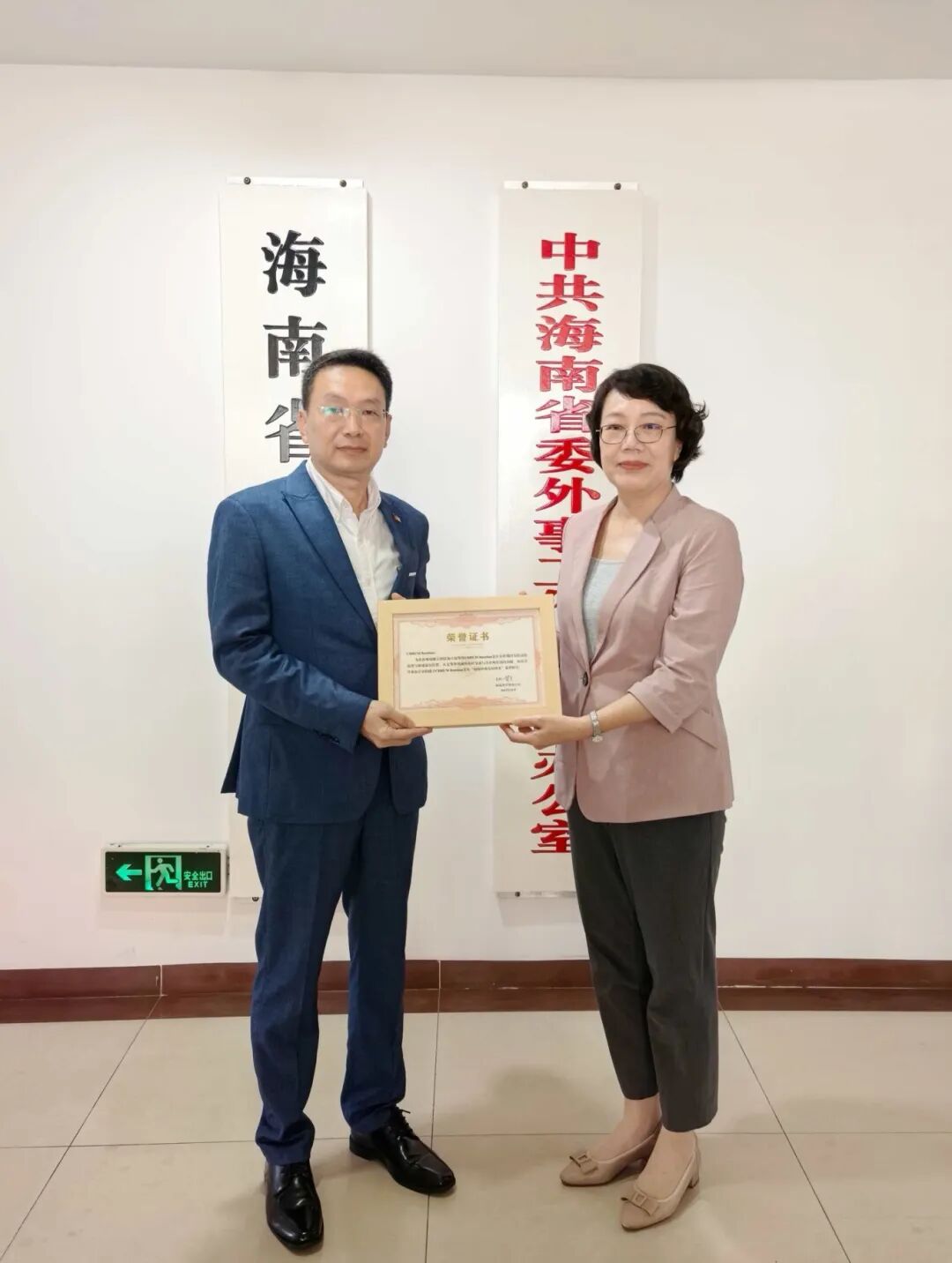 10月17日上午,即将离任的柬埔寨驻海口总领事冲帮丹礼节性拜会省外办,省外办主任戴贞与冲帮丹一行举行座谈,并为冲帮丹颁发“海南外事友好使者”证书。